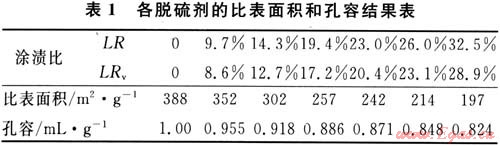 由表1看出,新脫硫劑的比表面積、孔容和孔徑都隨吸收劑涂漬比的增加而減小,同時由圖4可以看出,隨吸收劑涂漬比增加微孔大量減少,LR為32.5%的脫硫劑,微孔已經(jīng)基本消失。