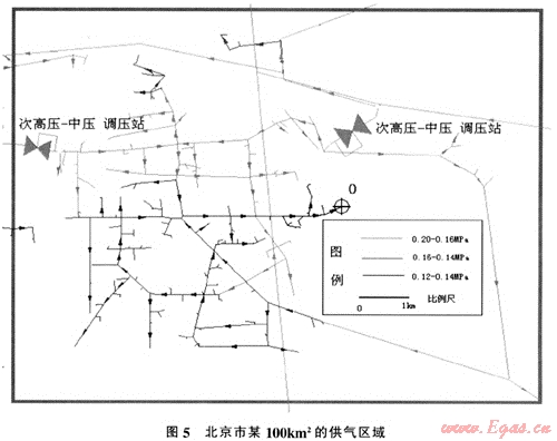 如圖5所示為北京市某區(qū)域天然氣管網(wǎng)圖,其供氣區(qū)域約為100km2。此區(qū)域內(nèi)中壓管網(wǎng)氣源,為兩座高中調(diào)壓站,供應(yīng)壓力為0.2MPa,高時總負荷70000(m3/h),負荷點422個.根據(jù)管網(wǎng)模擬軟件計算可知末端壓力為0.131MPa。處于該區(qū)域的東部(如上圖黑管線)。根據(jù)規(guī)劃此區(qū)域內(nèi)負荷將有明顯的增加.因此.必須提早做出切實可行的管網(wǎng)改造方法。