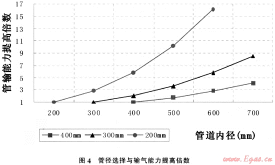 舊有的管網(wǎng)系統(tǒng)中管徑較小的管道有可能是制約管網(wǎng)通過能力的瓶頸。通過管網(wǎng)計算,北京市中壓管網(wǎng)主干線個別管段由于管徑較小,嚴重阻礙了管網(wǎng)輸送,應(yīng)將此管段進行擴徑,如香山南路管線,管徑為DN400。全長4000m。其中有一段DN100,導(dǎo)致附近壓力偏低,若將此段管線改為DN400,附近壓力由0.04MPa,升到0.06MPa。圖5所示為擴大管徑對管輸能力提高倍數(shù)的影響,計算式: