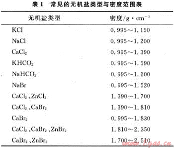 完井液、壓井液體系所采用的加重材料主要是可溶性無機(jī)鹽類,主要用來增加或調(diào)節(jié)完井液、壓井液的密度,常見的無機(jī)鹽及其密度范圍,見表1。對(duì)高含H2S的油氣井,進(jìn)行完井修井作業(yè)所采用的體系中不宜采用ZnCl2、ZnBr2作為加重材料,除非采用新型除硫劑技術(shù),以免因產(chǎn)生ZnS沉淀破壞液體性能的穩(wěn)定性,甚至誘發(fā)井下安全事故發(fā)生和損害地層。