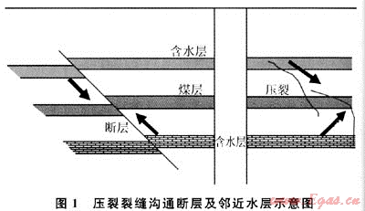 由于煤巖非均質(zhì)性強(qiáng),微孔隙、微裂縫發(fā)育,且斷裂韌性比常規(guī)砂巖、泥巖低,在水力壓裂施工過程中裂縫擴(kuò)展不完全受地應(yīng)力方位控制,還受濾失高的主天然裂縫控制。部分井在壓裂施工過程中,煤層破碎明顯,隨著裂縫的延伸,壓穿了上下砂巖層或連通了斷層,從而溝通了鄰近水層(圖1),在排采過程中產(chǎn)水量大,排水降壓困難,產(chǎn)氣量低或完全不產(chǎn)氣[11]。