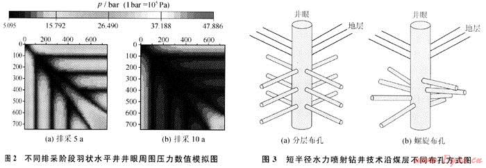 短半徑水力噴射鉆井技術(shù),其特點(diǎn)是可以實(shí)現(xiàn)在0.12m直徑的立井井段中完成從垂直轉(zhuǎn)向水平,并可以沿不同方位對(duì)煤層鉆水平孔眼開采煤層氣(圖3)。與常規(guī)直井水力壓裂相比,短半徑水力噴射鉆井具備定向效果好、穿透深度長(zhǎng)等一系列技術(shù)優(yōu)勢(shì)[12~13]:①水力噴射可以沿井筒任意方位進(jìn)行,從而可根據(jù)煤儲(chǔ)層應(yīng)力分布情況,使水平孔眼最大限度地溝通煤層天然裂縫,提高裂縫的導(dǎo)流能力;②能根據(jù)需求在煤層中沿不同方位鉆出120m以上的長(zhǎng)直孔,從而可以增大井眼與煤儲(chǔ)層接觸面積,擴(kuò)大煤層氣井的降壓解吸范圍;③煤層鉆孔后,孔眼周圍煤儲(chǔ)層應(yīng)力降低,形成新的微裂紋,從而可以提高水平孔眼周圍煤儲(chǔ)層透率;④水平孔眼可采取分層布孔或螺旋布孔,通過優(yōu)化孔眼結(jié)構(gòu)、充分利用孔眼間相互干擾作用可加快區(qū)域煤層氣降壓解吸,提高煤層氣井單井產(chǎn)量。