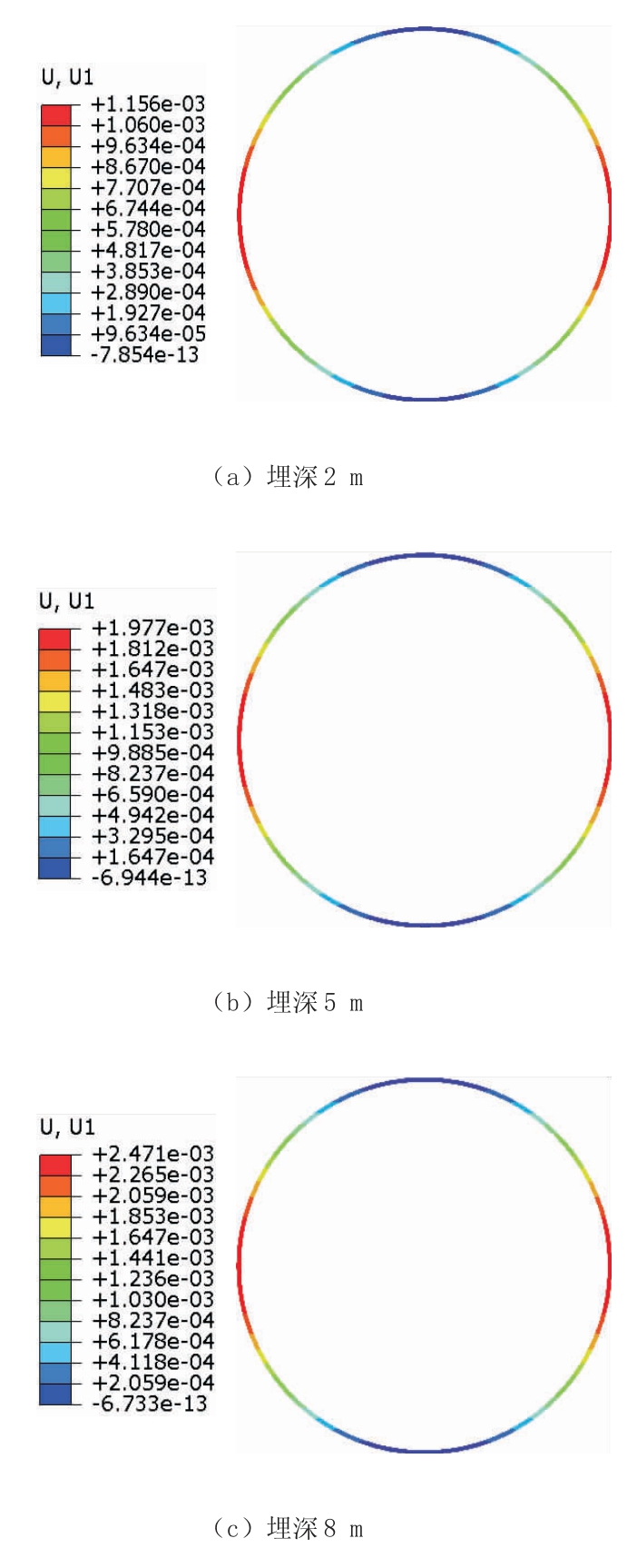 不同埋深下管體x 方向應(yīng)變分布云圖如圖6所示。 從圖6 可見,埋深 2 m、 5 m 和 8 m 時,x 方向的最大位移即最大變形分別為1.16 mm、1.98 mm 和2.47 mm。 隨著埋深的增加,管體受到的徑向位移逐漸增大,徑向變形主要集中在管體左、 右兩側(cè)。 y 方向的位移主要來自土壤自身的變形和鋼管受土體的作用力后發(fā)生的變形。