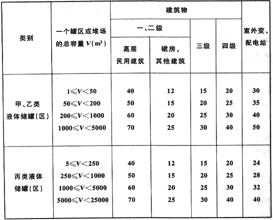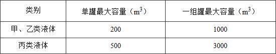 注:1 當(dāng)甲、乙類(lèi)液體儲(chǔ)罐和丙類(lèi)液體儲(chǔ)罐布置在同一儲(chǔ)罐區(qū)時(shí),罐區(qū)的總?cè)萘靠砂?m3甲、乙類(lèi)液體相當(dāng)于5m3丙類(lèi)液體折算。