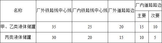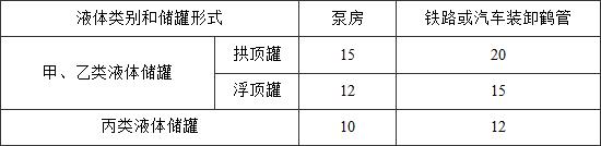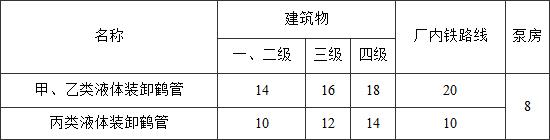 注:裝卸鶴管與其直接裝卸用的甲、乙、丙類(lèi)液體裝卸鐵路線的防火間距不限。