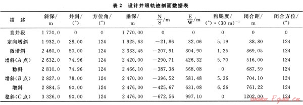 直井段采用自浮式單點(diǎn)測(cè)斜儀和電子多點(diǎn)測(cè)斜儀監(jiān)測(cè);造斜段和水平段用無(wú)線隨鉆測(cè)斜儀全程跟蹤監(jiān)測(cè),用電子多點(diǎn)測(cè)斜儀復(fù)測(cè)。