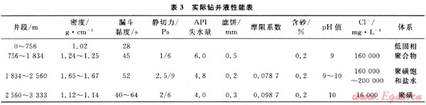 直井段采用低固相聚合物體系,膏鹽層段采用聚磺欠飽和一飽和鹽水體系,第3次開(kāi)鉆井段采用聚磺體系。由于鹽層中高壓鹽水的存在,其存在又無(wú)規(guī)律,鹽水浸入又易導(dǎo)致鹽析發(fā)生卡鉆事故,現(xiàn)場(chǎng)試驗(yàn)地層破裂壓力系數(shù)在1.9g/cm3以上。因此,該井膏鹽層使用了比直井更高的鉆井液密度,目的是防止斜井段高壓鹽水浸和鹽層蠕動(dòng)變形。在膏鹽層段主要要提高鉆井液的潤(rùn)滑性,防止阻卡及降低鉆井液的流動(dòng)阻力,提高鉆井液的抗污染能力。有效避免鹽膏層的溶解、污染、縮徑、大井徑、井塌等一系列井下復(fù)雜和事故的發(fā)生,實(shí)際鉆井液性能,見(jiàn)表3。