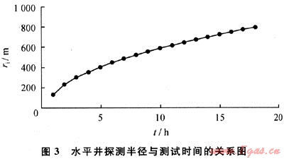 給定水平井段長度為500m,氣層厚度為40m,水平滲透率為0.005μm2,各向異性系數為2,氣體黏度為0.04mPa·s,孔隙度為10%,綜合壓縮系數為0.0005MPa-1,測試時間1~18h。由式(8)得出探測半徑與測試時間的關系如圖3所示。從圖3可以看出,探測半徑隨時間延長上升幅度減小,呈現非線性特征。