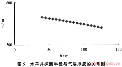 給定氣層厚度40~125m,其他參數同前,由式(8)得出探測半徑與氣層厚度的關系(圖5)??梢钥闯觯簹鈱雍穸仍龃?,探測半徑減小,但減小的幅度很小。此即說明滲流截面積越大,壓力波向地層推進越慢。