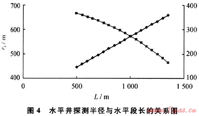 給定水平井段長500~1350m,測試時間10h,其他參數同前,由式(8)得出探測半徑與水平段長度的關系(圖4)??梢钥闯觯簲M圓形坑道外緣半徑隨水平段長的增產而變大,而探測半徑是降低的。
