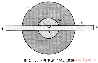 ;利用產量等值原則,將線性水平井段簡化為擬圓形坑道,應該看到中心圓形半徑為rpc=L/4,由于生產坑道空間自身的圓形半徑為h/2。因此圓形坑道的外緣半徑為rpce=(L/4)+(h/2)。從供給邊境至圓形坑道外緣的流動為平面徑向流,從擬生產坑道的外緣半徑至生產井底的流動為氣層厚度h的空間高度上、垂直并圍繞水平井段的平面徑向流,半徑為氣層高度之半(h/2)。3 水平井探測半徑的概念