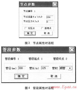 定義以管道為中心線且平行于管道的小面積矩形為線捕捉區(qū)域,以節(jié)點(diǎn)為圓心的小面積圓形為點(diǎn)捕捉區(qū)域,鼠標(biāo)在上述區(qū)域內(nèi)雙擊會分別彈出節(jié)點(diǎn)屬性和管段屬性對話框帕J,見圖3、4,為相應(yīng)的節(jié)點(diǎn)輸入流量或壓力,為相應(yīng)的管段輸入管長、管徑、管材。對于多氣源管網(wǎng)還需輸入氣源屬性,程序通過節(jié)點(diǎn)編號重排使得壓力基準(zhǔn)點(diǎn)編號最大,定壓點(diǎn)隨基準(zhǔn)點(diǎn)居后編排,便于節(jié)點(diǎn)方程組的求解。點(diǎn)捕捉和線捕捉技術(shù)實(shí)現(xiàn)了管網(wǎng)圖和數(shù)據(jù)的緊密結(jié)合,更加直觀、形象,輸入大量管段和節(jié)點(diǎn)參數(shù)時,很大程度上減少了輸入的差錯,提高了效率。