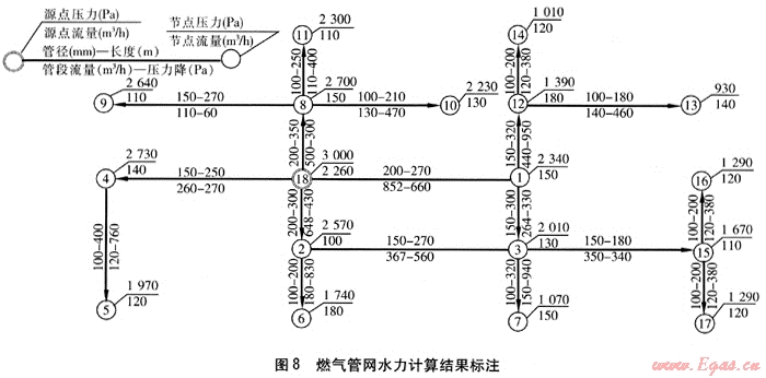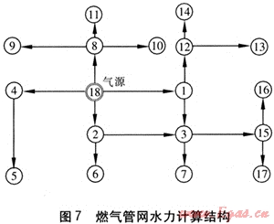 圖7為燃?xì)夤芫W(wǎng)水力計(jì)算結(jié)構(gòu),進(jìn)行水力計(jì)算后在Auto CAD中自動輸出的水力計(jì)算結(jié)果標(biāo)注圖見圖8。