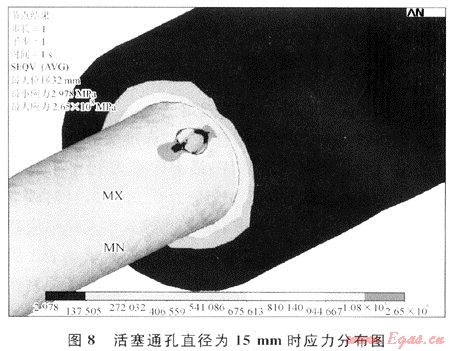 由表2可以看出,當(dāng)缸體通孔直徑為26mm時(shí),缸體最大應(yīng)力值小于材料許用應(yīng)力,缸體安全。此時(shí)的通孔應(yīng)力分布如圖9所示。