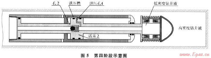 4) 泄壓孔與泄壓槽相連通,卡齒泄壓縮回。如圖5所示,當(dāng)隔板接近活塞2時(shí),活塞2上的泄壓孔4與活塞缸上的泄壓槽連通,活塞桿右段及卡盤內(nèi)的低密度鉆井液經(jīng)泄壓孔4、泄壓槽、孔2、活塞桿左段的內(nèi)孔與套管內(nèi)的低密度鉆井液連通而泄壓,卡齒受到碟簧的彈力而收回,整個(gè)水平井套管牽引工具回復(fù)到初始狀態(tài)。