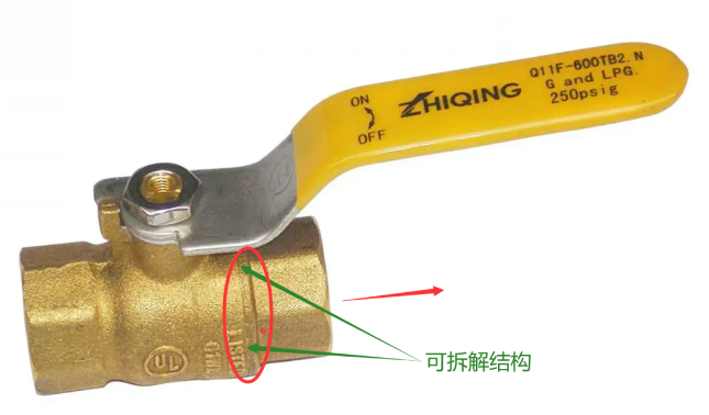 如果上述的球閥安裝方向分正反的話,那這種常見(jiàn)的球閥我想是不是也該按紅色箭頭安裝方向進(jìn)行安裝。因?yàn)橛覀?cè)也是一個(gè)可拆解的結(jié)構(gòu)(猜測(cè)很難拆解,但維修過(guò)閥門(mén)的都知道,另外閥門(mén)本體此處泄漏的可能性有多少?)。