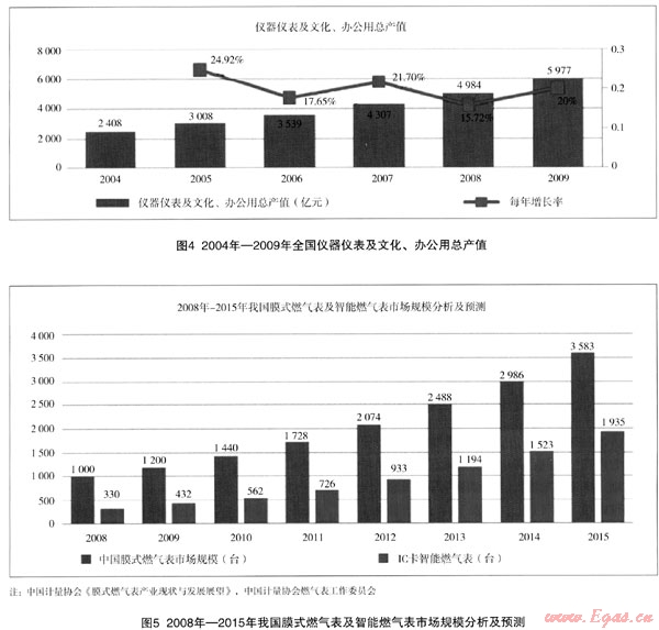 根據(jù)中國計(jì)量協(xié)會的相關(guān)數(shù)據(jù),我國目前約有100家燃?xì)獗韽S,2008年總產(chǎn)量為1000萬臺,每年的復(fù)合增長率約為20%。具有中國特色的智能膜式燃?xì)獗?,以IC卡預(yù)付費(fèi)為主導(dǎo)產(chǎn)品,總量逐年上升,已占膜式燃?xì)獗砜偭康?0%以上。預(yù)計(jì)2015年我國燃?xì)獗砜偖a(chǎn)量為3583萬臺,智能燃?xì)獗砜偖a(chǎn)量為1935萬臺。
