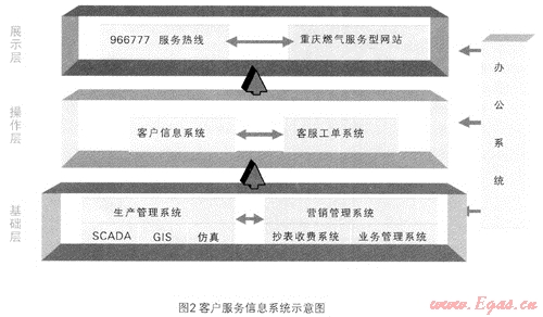 重慶燃?xì)饧瘓F(tuán)充分利用現(xiàn)代計(jì)算機(jī)和通訊技術(shù),創(chuàng)建了先進(jìn)的客戶服務(wù)信息系統(tǒng),包括生產(chǎn)管理、營(yíng)銷管理、客戶資料、客戶服務(wù)工單、966777服務(wù)熱線五個(gè)方面,整個(gè)系統(tǒng)資源共享、無縫銜接,為客戶提供精細(xì)服務(wù)。服務(wù)流程是客戶服務(wù)工作的導(dǎo)向,為保證服務(wù)流程的統(tǒng)一,集團(tuán)公司通過建設(shè)客戶服務(wù)信息系統(tǒng),對(duì)服務(wù)流程進(jìn)行優(yōu)化,并在信息系統(tǒng)中對(duì)關(guān)鍵流程進(jìn)行固化。見圖2: