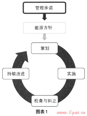 用能企業(yè)是實現(xiàn)能源節(jié)約的核心。在以節(jié)能減排為重要目標(biāo)的指引下,企業(yè)使用任何能源,都應(yīng)制定一個基本的控制程序,形成一個有效能源管理體系運行模式。企業(yè)為兌現(xiàn)管理承諾和實現(xiàn)能源方針應(yīng)進行策劃-實施-檢查與糾正-持續(xù)改進(PDCA)等過程。圖示如下(圖表1):