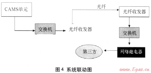 利用鋪設的備用光纖組建局域網(wǎng),通過交換機把5臺控制器接入,同時也將設置在“主調(diào)中心”內(nèi)部監(jiān)控中心的“CAMS單元”通過交換機接入整體系統(tǒng)來實現(xiàn)對前端5臺控制器的集中管理,利用CAMS單元的電子地圖功能來對防護目標進行實時監(jiān)控。“光纖收發(fā)器”和“網(wǎng)絡繼電器”以及“CAMS單元”來實現(xiàn)前端管道現(xiàn)場其它設備的聯(lián)動(圖4)。