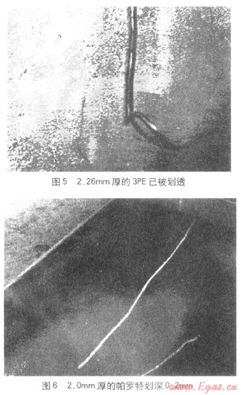國內(nèi)外法定檢驗機構(gòu)的檢測結(jié)果表明,雙層環(huán)氧聚合物混凝土結(jié)構(gòu)涂層具有比3PE更優(yōu)異的耐劃傷性(圖5、6)、耐磨損性,其補口處與管體同高,還與陰極保護系統(tǒng)有很好的匹配性。帕羅特已被美國定向穿越工程承包協(xié)會DC CA(Directional Crossing Contractors Association)指定為定向穿越覆蓋層專用保護產(chǎn)品。