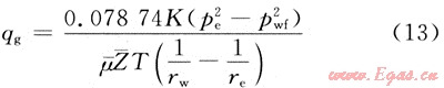 3) 公式(12)壓力平方分布表達式表明:在井底附近,半球流穩(wěn)定流比平面徑向流壓力變化快得多,在同等條件下,采用半球流穩(wěn)定滲流計算的產(chǎn)氣能力要小于平面徑向穩(wěn)定滲流計算的產(chǎn)氣能力。