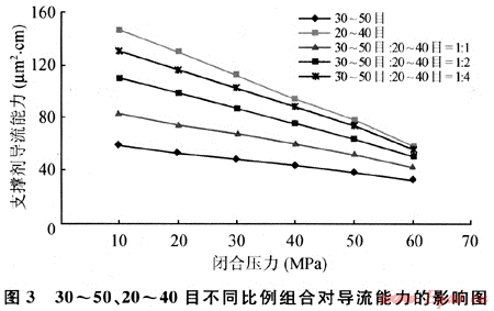 針對地應力高、地層濾失大、裂縫寬度小的特點,通過室內30~50目和20~40目陶粒組合導流能力實驗表明,30~50目和20~40目陶粒以1:4組合加入,不會顯著影響導流能力(導流能力降低小于10.0%),而可以以小粒徑陶粒填充窄裂縫,待形成一定寬度后再加入20~40目陶粒,可以提高施工成功率(圖3)。