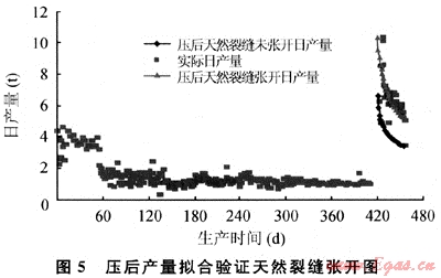 由圖4可知,一旦微裂縫張開(kāi),壓后累積產(chǎn)量就增加明顯,而且累積產(chǎn)量隨裂縫張開(kāi)面積的增加而極為明顯地增加,產(chǎn)量與微裂縫張開(kāi)面積密切相關(guān),因此有必要提高施工砂液比,甚至采取縫內(nèi)暫堵技術(shù)來(lái)大幅度的提高縫內(nèi)凈壓力,盡可能使更多天然微裂縫張開(kāi),這是該油氣田高砂液比和縫內(nèi)暫堵壓裂取得好的效果的原因,相信也是開(kāi)發(fā)這類低滲透油氣田的關(guān)鍵所在。