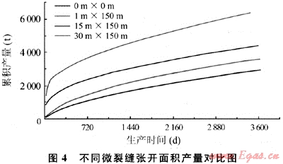 采用相同的輸入?yún)?shù),微裂縫張開(kāi)面積分別假設(shè)為0m2、150m2(1m×150m,天然微裂縫張開(kāi)范圍為裂縫長(zhǎng)度方向150m,垂直裂縫方向1m,以下同),2250m2(15m×150m),4500m2(30m×150m),裂縫孔隙度為0.12%,微裂縫滲透率為800μm2。圖4給出了不同微裂縫張開(kāi)面積下的累積產(chǎn)量隨時(shí)間的變化曲線。