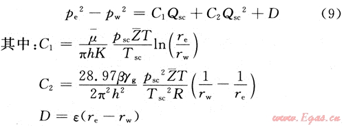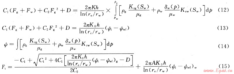 假設(shè)一口氣水兩相流氣井位于均質(zhì)、水平等厚的無限大地層中,儲層中發(fā)生氣、水兩相等溫滲流,符合非線性滲流方程式(5)、式(6),氣、水彼此互不相溶,忽略重力及毛細(xì)管力的影響。當(dāng)?shù)蜐B透多孔介質(zhì)中的流體遵循非線性滲流方程式(5)、(6)時,氣體在低滲透多孔介質(zhì)中遵循二項式運(yùn)動規(guī)律,即式(1),相應(yīng)的產(chǎn)能方程可寫為[7]: