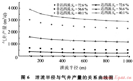 當(dāng)井底流動壓力為10MPa、即生產(chǎn)壓差為10MPa時,在同樣的泄流半徑條件下,隨著低滲透儲層含水飽和度的增大,氣井產(chǎn)能逐漸減?。辉谕瑯雍柡投葪l件下,隨泄流半徑的增加,氣井產(chǎn)量下降,氣井產(chǎn)量在泄流半徑小于200m的范圍內(nèi)下降幅度較大,大于200m以后,下降幅度減緩,當(dāng)泄流半徑超過300m后,氣井產(chǎn)量基本不再受泄流半徑的影響。在理論上低滲透氣井的合理井距應(yīng)布置在600m以內(nèi)為宜(圖6)。