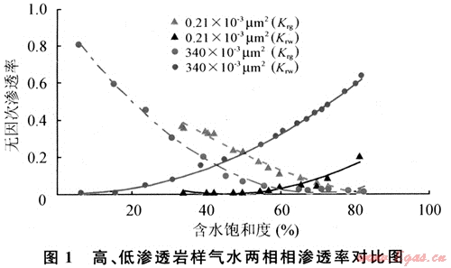 實驗表明,較之于中高滲透巖心而言,低滲透巖樣氣相、水相最大相對滲透率值較小。氣、水共滲區(qū)域較窄,隨含水飽和度升高,水相相對滲透率上升緩慢,水相形成連續(xù)流動,而氣相無因次滲透率迅速下降接近于0,出現(xiàn)所謂的“水鎖”現(xiàn)象[3](圖1)。Muskat等人[5]建立的兩相滲流運(yùn)動方程成立的前提是相對滲透率僅是含水飽和度的函數(shù),而不受壓力、流速以及界面阻力的影響。即