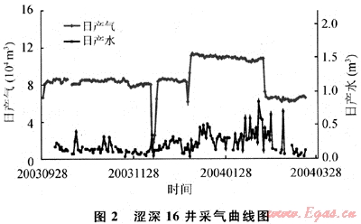 青海氣區(qū)的澀北一號(hào)氣田,從2000年以來(lái)屬于建產(chǎn)上產(chǎn)階段,但調(diào)峰氣量卻逐年加大。由于調(diào)峰對(duì)氣、水產(chǎn)量的影響也很明顯。統(tǒng)計(jì)2003年冬季該氣田主要參與調(diào)峰提產(chǎn)的13口氣井,提產(chǎn)前日產(chǎn)氣量87.4×104m3,日產(chǎn)水3.9m3,調(diào)峰期(61d)日產(chǎn)氣108×104m3,日產(chǎn)水9m3,調(diào)峰結(jié)束恢復(fù)原工作制度后,日產(chǎn)氣82.5×104m3,日產(chǎn)水8.7m3。很明顯氣量減少,而水量增加。如澀深16井調(diào)峰前后的氣、水產(chǎn)量曲線(圖2),調(diào)峰結(jié)束后氣量達(dá)不到調(diào)峰前的水平,而產(chǎn)水量卻明顯上升。