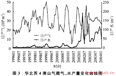 華北油田的蘇4潛山氣藏,合理產(chǎn)能為30×104m3/d,調(diào)峰期產(chǎn)量45×104~50×104m3/d,提產(chǎn)幅度50%~67%,2002年以前日產(chǎn)水量50m3以下。因多次向北京供氣調(diào)峰,2002年以后日產(chǎn)水量增加到120~200m3,且放大壓差產(chǎn)氣量也不再增加,表明氣藏已進(jìn)入遞減期(圖3)。