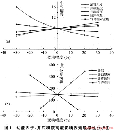 敏感性分析是分析各種不確定性因素變化到一定的幅度時,對所關(guān)注指標(biāo)的影響程度,并把不確定性因素當(dāng)中對關(guān)注指標(biāo)影響程度較大的因素,稱之為敏感性因素[4~5]。由圖1可以看出動能因子對生產(chǎn)油管的內(nèi)徑尺寸敏感性最強(qiáng),其次是日產(chǎn)氣量和井底流動壓力,而氣體的相對密度和井底溫度的變化對動能因子影響較小。由此我們可以得出結(jié)論:當(dāng)以目前的產(chǎn)量下不能完全攜液時,及時地更換較小管徑的管柱生產(chǎn)能有效地提高氣井的攜液能力。當(dāng)氣井的流量下降到臨界流量以下后,氣井不能依靠自己的能量完全排出地層產(chǎn)出的液體,就會在井底出現(xiàn)不同程度的積液。由圖1可以看出積液高度對管鞋處的壓力、井口套壓極其敏感,所以要準(zhǔn)確判斷井底積液的高度,一定要取準(zhǔn)井口的生產(chǎn)套壓和井底管鞋處的流動壓力,否則計(jì)算出的結(jié)果誤差較大。