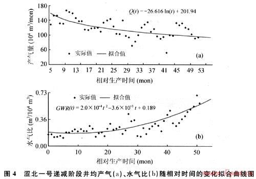 對澀北一號氣田遞減階段的井均日產(chǎn)氣量、氣水比隨相對生產(chǎn)時間的變化關(guān)系進(jìn)行回歸,得到如下關(guān)系式(圖4)。