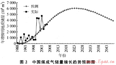 煤成氣儲量增長預(yù)測參數(shù)選取:A=4500,C=12,x=3,T0=1988。