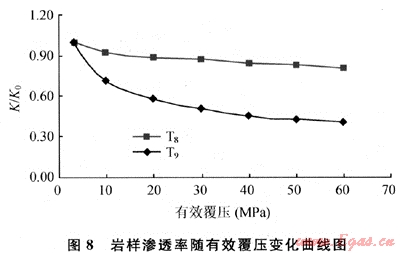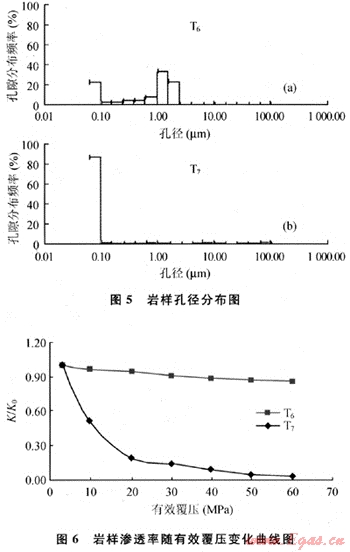 T6(K0’=12.62×10-3μm2,φ0=14.8%)和T7(K0’μm2,φ0=3.7%)是孔滲參數(shù)差=0.079×10-3異較大的兩塊巖樣。從巖樣的孔徑分布圖與覆壓滲透率變化曲線(圖5、6)可以看出:對(duì)于低孔低滲透巖樣,小孔徑占了絕大多數(shù),在覆壓實(shí)驗(yàn)中,小孔道一旦受到壓縮發(fā)生塑性變形就會(huì)嚴(yán)重喪失滲流功能,導(dǎo)致巖樣的滲透率大幅下降,表現(xiàn)出較強(qiáng)的應(yīng)力敏感性。