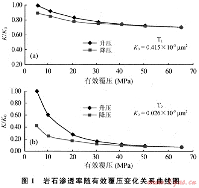 圖1是采用CMS300測(cè)得的低滲透巖石滲透率與有效覆壓關(guān)系曲線。從圖1可看出:①巖樣初始滲透率(K0’越低,滲透率在有效覆壓增加的過(guò)程中的下降幅度越大;②滲透率在有效覆壓增大的初始階段下降幅度最大,覆壓降低后滲透率不能完全恢復(fù),說(shuō)明巖樣在實(shí)驗(yàn)過(guò)程中發(fā)生了微量的軟塑性變形。)