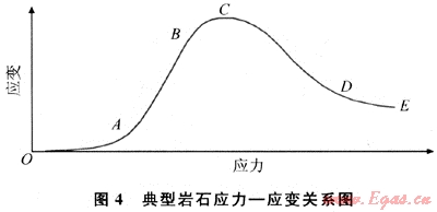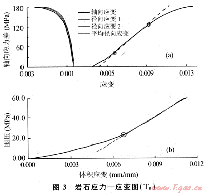 圖3是采用三軸巖石力學(xué)測(cè)試系統(tǒng)得到的巖石應(yīng)力-應(yīng)變關(guān)系曲線。從圖3-a可以看出:在應(yīng)力增大的初始階段,巖石發(fā)生的變形較大,有一定軟塑性變形,隨著軸向應(yīng)力增大(超過(guò)30MPa),逐漸過(guò)渡到穩(wěn)定的彈性變形階段,超過(guò)彈性極限后,巖石進(jìn)入塑性變形階段,最終破壞失穩(wěn)。從圖3-b則可以更明顯地看出巖石在圍壓增大的初始階段變形較大,整個(gè)變形過(guò)程不是線彈性變形過(guò)程。