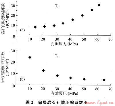圖2是采用增加圍壓與降低孔隙壓力兩種方法所測(cè)得的巖石孔隙壓縮系數(shù)與應(yīng)力的關(guān)系曲線。從圖2中可以看出是變化值而非固定值,初始值很高,隨著圍壓增大、孔隙壓力減小,下降很快,圍壓、孔隙壓力達(dá)到一定值后,變化不大,保持穩(wěn)定,這表明在實(shí)驗(yàn)過(guò)程中巖石發(fā)生的并非理想的線彈性變形。