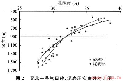 壓實(shí)作用是沉積物最重要的成巖作用之一,它導(dǎo)致孔隙水排除,孔隙度減少,巖石體密度增加。三湖地區(qū)第四系地層主要的成巖作用是壓實(shí)作用,不同巖性其壓實(shí)特征不盡相同。研究表明,壓實(shí)早期對(duì)泥巖的影響較對(duì)砂巖顯著,0~2000m深度范圍內(nèi),頁(yè)巖的孔隙度隨深度的變化速率相對(duì)較大,而砂巖的變化速率相對(duì)較小,在相同深度范圍內(nèi),泥質(zhì)巖物性變化的速率總比砂質(zhì)巖性大(圖2)。特別是深度超過(guò)900m,由于地層水的大量排出,泥巖塑性消失,已相當(dāng)致密且明顯成層;粉砂巖已趨于點(diǎn)接觸,但是膠結(jié)物較少,仍較疏松。泥質(zhì)巖壓實(shí)程度超過(guò)砂質(zhì)巖,兩者排替壓力差逐漸增大,泥巖層易形成側(cè)向封堵,有利于巖性氣藏形成。