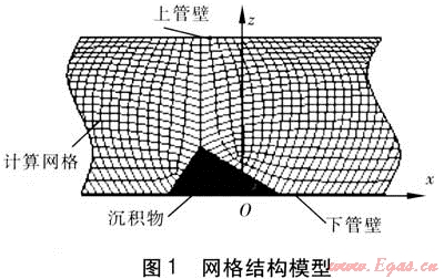 研究模型采用二維四邊形網(wǎng)格結(jié)構(gòu)模型,模擬的輸氣管道直徑與長度之比為1:6,沉積物在三方向的高度與管徑之比為3:10,煤層氣輸氣管道的豎直軸截面處在xOz平面內(nèi),x軸與下管壁重合,原點取在模擬段下管壁的中心位置上,見圖1,用三角形模擬沉積物。