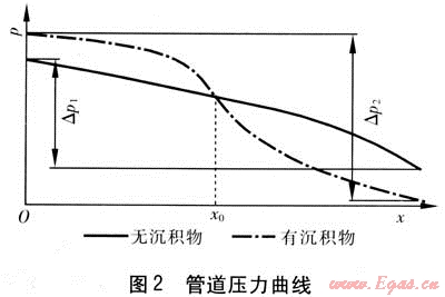 假設煤層氣在管道中正常輸運時,全線的壓力降主要是由管壁的摩擦引起的,其壓力曲線見圖2的粗實線,此時壓力基本上保持均勻下降,其兩端的壓力差用△p1來表示。