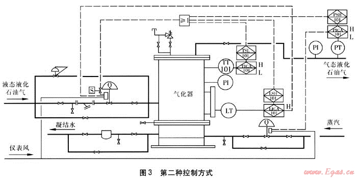 第二種控制方式是用氣化器的出氣壓力控制蒸汽調(diào)節(jié)閥的開度,用液位控制進液調(diào)節(jié)閥的開度。同樣,對氣化器設(shè)置液位高限、出氣溫度低限和出氣壓力高限,當出現(xiàn)任何一個或多個限值時切斷氣化器進液調(diào)節(jié)閥。