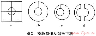 ③ 將剪好的工程紙?zhí)兹肴細夤艿?,覆蓋到套管上,用錘子垂直擊打工程紙,得到管道與套管之間圖形的壓環(huán)模版,見圖2c。