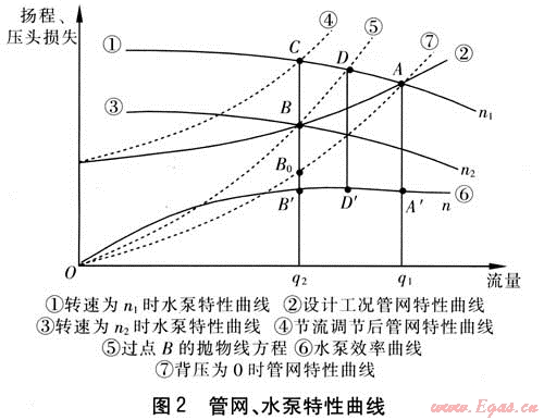 假設(shè)水泵的設(shè)計(jì)工況點(diǎn)為點(diǎn)4,對(duì)應(yīng)轉(zhuǎn)速n1、流量q1、揚(yáng)程hA、功率PA、效率ηA?,F(xiàn)需把流量調(diào)到q2,采用以下兩種方法:采用節(jié)流調(diào)節(jié),水泵的工況點(diǎn)變?yōu)辄c(diǎn)C,對(duì)應(yīng)轉(zhuǎn)速n1、流量q2、揚(yáng)程hC、功率PC、效率ηC;采用變頻調(diào)節(jié),水泵的工況點(diǎn)變?yōu)辄c(diǎn)B,對(duì)應(yīng)轉(zhuǎn)速n2、流量q2、揚(yáng)程hB、功率PB、效率ηB。管網(wǎng)、水泵特性曲線見(jiàn)圖2,下面分析變頻調(diào)節(jié)工況參數(shù)隨背壓的變化。