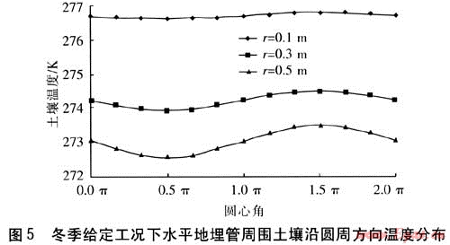 由圖5可知:①土壤溫度沿圓周方向呈正弦曲線分布,每個(gè)圓周上溫度最高點(diǎn)(曲線波峰)都是出現(xiàn)在原平面的1.5π方向,即圓周最底端;溫度最低點(diǎn)(曲線波谷)出現(xiàn)在原平面的0.5π方向,即圓周最頂端。②圓周方向上的土壤溫度呈正弦曲線分布,但每個(gè)圓周上的土壤平均溫度不同,即土壤溫度沿3條正弦曲線都在自己的中心線附近變化。這是由于隨著圓周遠(yuǎn)離地埋管,土壤溫度逐漸降低,r=0.1m圓周上的土壤平均溫度要高于r=0.3、0.5m圓周上的土壤平均溫度。③圓周方向上的土壤溫度呈正弦曲線分布,但每個(gè)圓周上的土壤溫度變化幅度各不相同,即溫度曲線的振幅不同。r=0.1m的曲線振幅最小,r=0.5m的曲線振幅最大,即距地埋管中心越近的圓周,其上土壤溫度變化程度越小;距地埋管中心越遠(yuǎn)的圓周,其上土壤溫度變化程度越大。這是由于地埋管上方的土壤隨著位置越遠(yuǎn)離地埋管越易受到大氣低溫的影響,因此地埋管上方的土壤隨著位置遠(yuǎn)離地埋管,溫度逐漸降低,而且這種降低的速度越來越快。而地埋管下方的土壤隨著位置越遠(yuǎn)離地埋管受大氣低溫的影響越小,這部分土壤由于遠(yuǎn)離地埋管溫度也逐漸降低。但由于深度加大受大氣低溫影響減小,這種降低的速度卻是越來越慢的。這就導(dǎo)致在距地埋管距離越遠(yuǎn)的圓周上,土壤溫度差距越大,即同一圓周上土壤的溫度變化越劇烈,變化的范圍越大。
