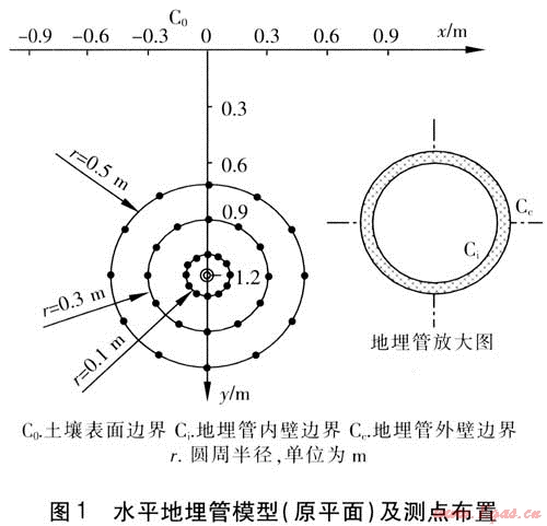 國內(nèi)外對土壤源熱泵的研究主要集中在以下幾個(gè)方面:地埋管換熱器傳熱模型,地埋管的敷設(shè)形式及管材,土壤特性對地埋管換熱器傳熱性能的影響,系統(tǒng)的設(shè)計(jì)和安裝,回填材料,土壤源熱泵系統(tǒng)的能耗分析及技術(shù)經(jīng)濟(jì)評價(jià),帶輔助裝置的混合式土壤源熱泵。這些研究主要涉及土壤與地埋管換熱器的熱交換特性,即地埋管壁及其周圍土壤的溫度場分布[1]。