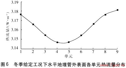由圖6可知,地埋管外表面上各單元的熱流量并不是均勻分布的,象平面上的單元9熱流量最高,單元4、5熱流量最低,其他對稱單元(單元3與6、單元2與7、單元1與8)的熱流量相等。對應(yīng)到原平面上,即地埋管上部各單元的熱流量較高,下部各單元的熱流量較低,地埋管兩側(cè)各單元的熱流量沿原平面y軸對稱分布,對稱單元熱流量相等。地埋管底部單元(單元4、5)的熱流量最低,管道頂部單元(單元9)的熱流量最高。這是由于地埋管外表面沿圓周溫度不同,地埋管外表面各單元的熱流量也不等,即地埋管外表面熱流量分布是不均勻的。